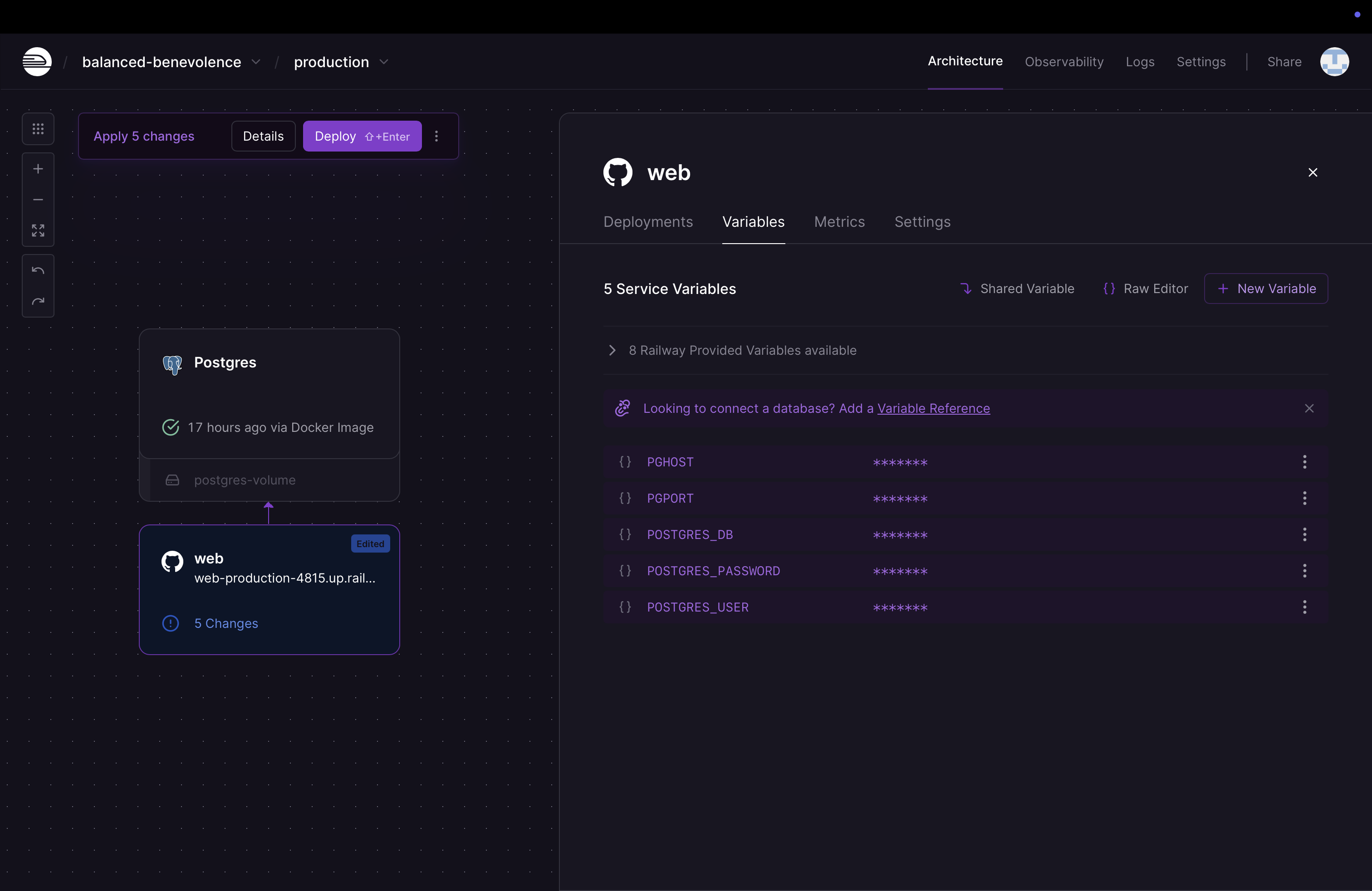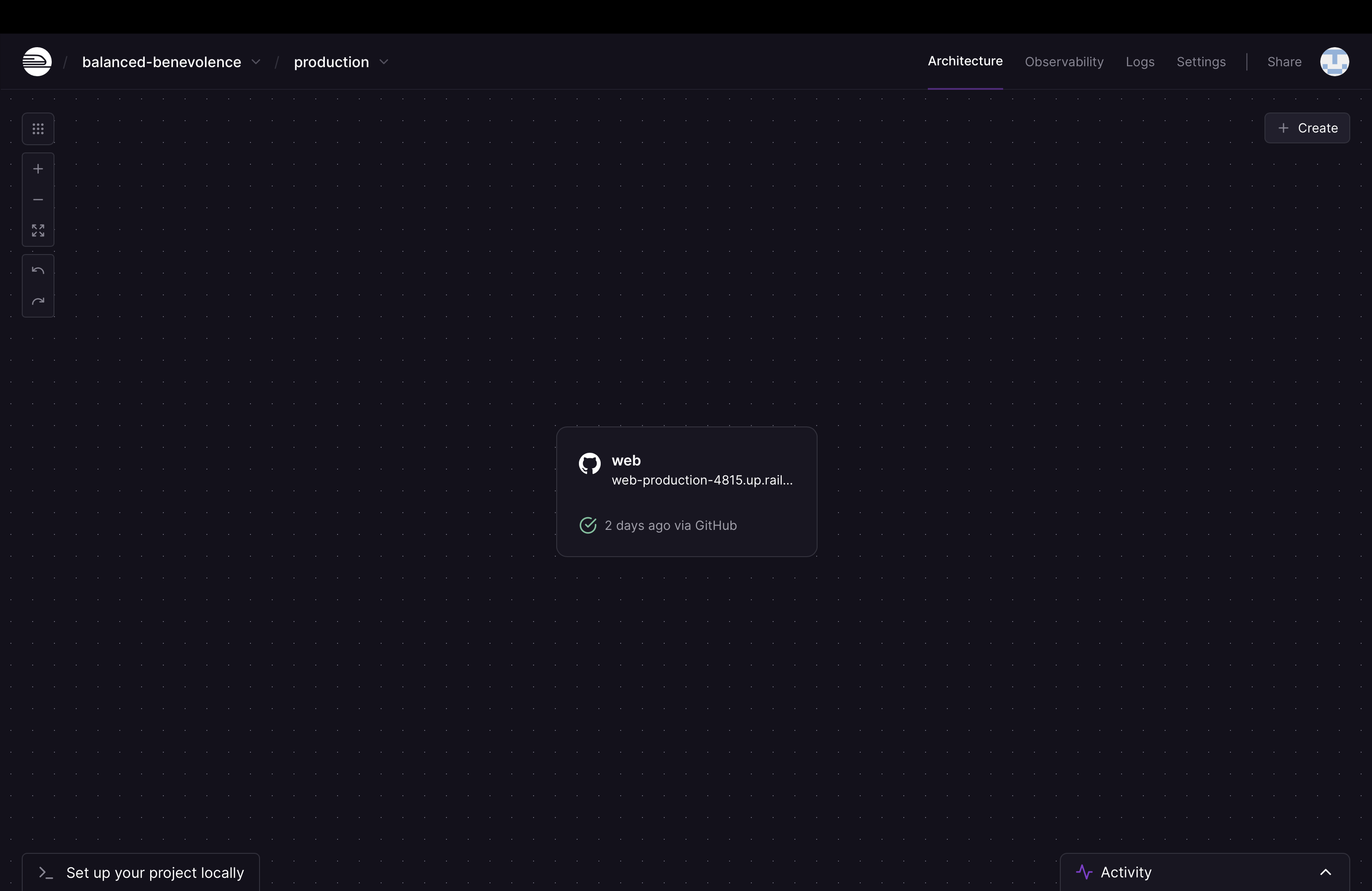 Switch to your project in Railway and look at your web server deployment, which was triggered by the commit we just pushed to GitHub.