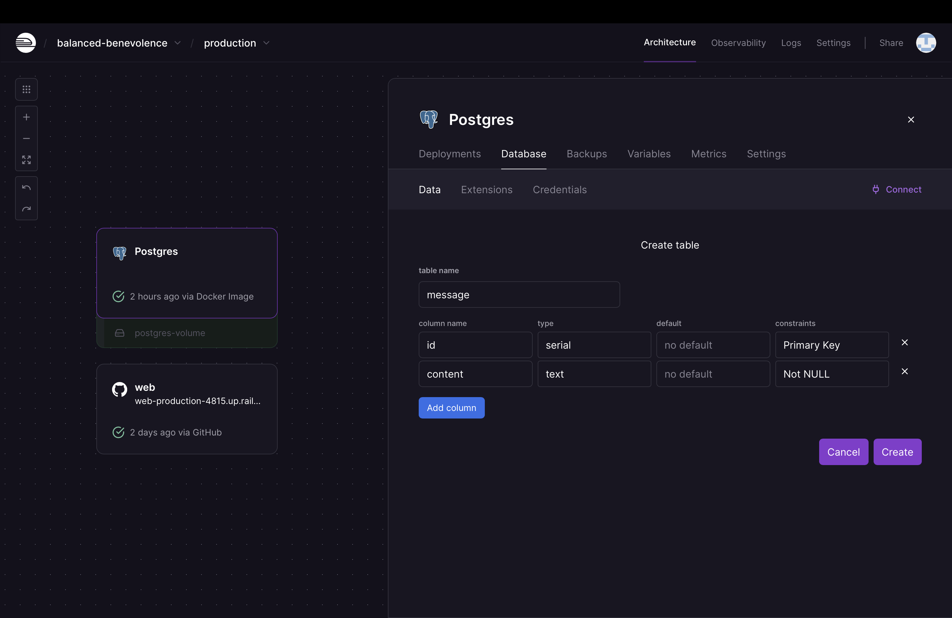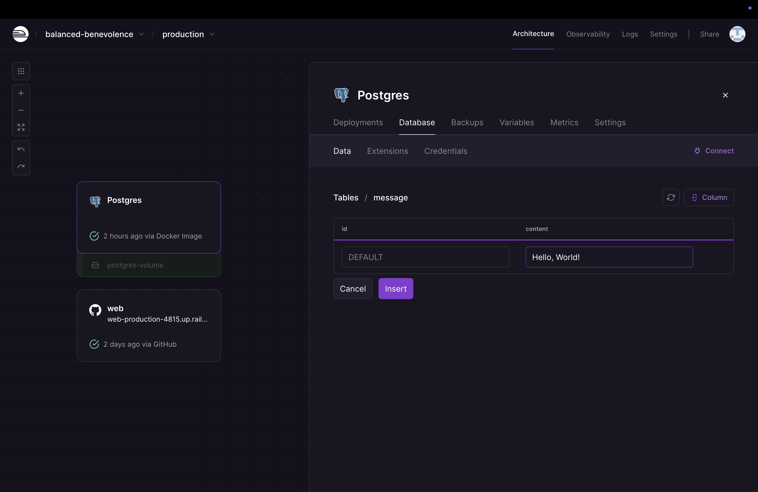 In this part, we’ll add a database to our Railway deployment and flesh out our application by adding a view to our front end that displays a message pulled by the server from our database.